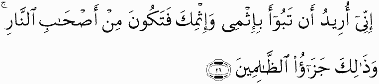 Indeed I want you to obtain [thereby] my sin and your sin so you will be among the companions of the Fire. And that is the recompense of wrongdoers."