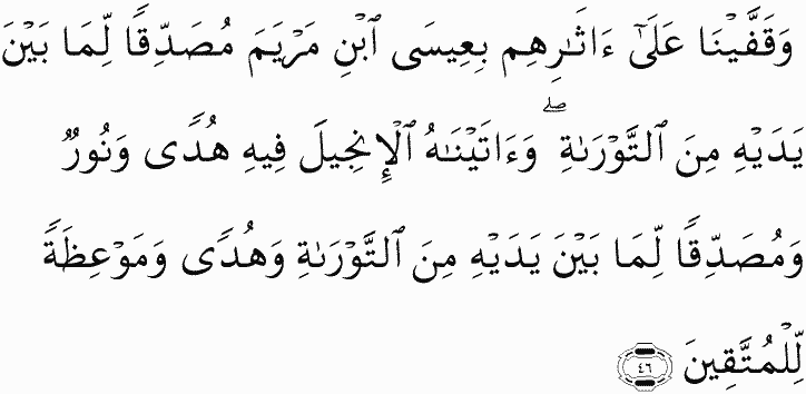 And We sent, following in their footsteps, Jesus, the son of Mary, confirming that which came before him in the Torah; and We gave him the Gospel, in which was guidance and light and confirming that which preceded it of the Torah as guidance and instruction for the righteous.