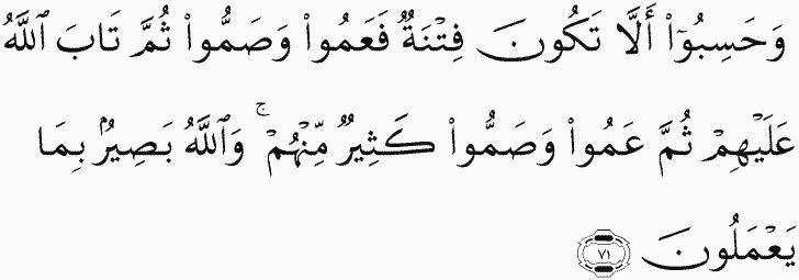 And they thought there would be no [resulting] punishment, so they became blind and deaf. Then Allah turned to them in forgiveness; then [again] many of them became blind and deaf. And Allah is Seeing of what they do.