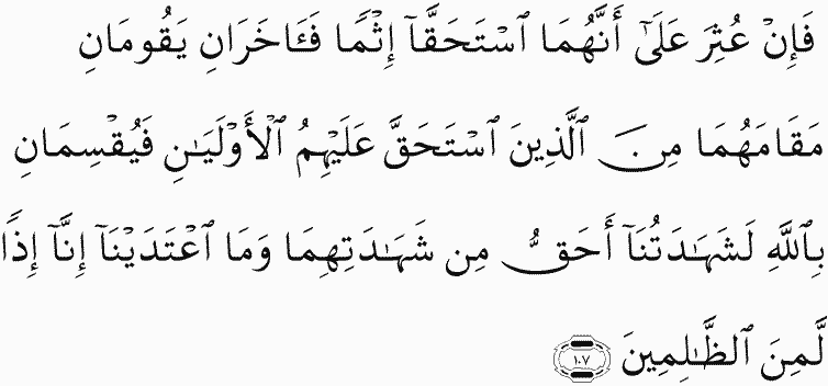 But if it is found that those two were guilty of perjury, let two others stand in their place [who are] foremost [in claim] from those who have a lawful right. And let them swear by Allah , "Our testimony is truer than their testimony, and we have not transgressed. Indeed, we would then be of the wrongdoers."