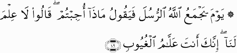 [Be warned of] the Day when Allah will assemble the messengers and say, "What was the response you received?" They will say, "We have no knowledge. Indeed, it is You who is Knower of the unseen"