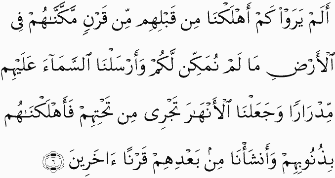 Have they not seen how many generations We destroyed before them which We had established upon the earth as We have not established you? And We sent [rain from] the sky upon them in showers and made rivers flow beneath them; then We destroyed them for their sins and brought forth after them a generation of others.