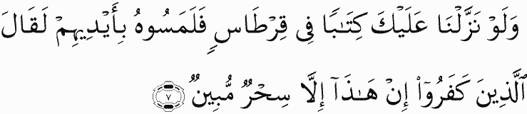 And even if We had sent down to you, [O Muhammad], a written scripture on a page and they touched it with their hands, the disbelievers would say, "This is not but obvious magic."