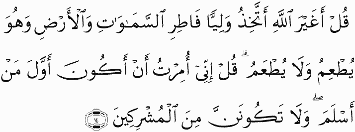 Say, "Is it other than Allah I should take as a protector, Creator of the heavens and the earth, while it is He who feeds and is not fed?" Say, [O Muhammad], "Indeed, I have been commanded to be the first [among you] who submit [to Allah ] and [was commanded], 'Do not ever be of the polytheists.' "