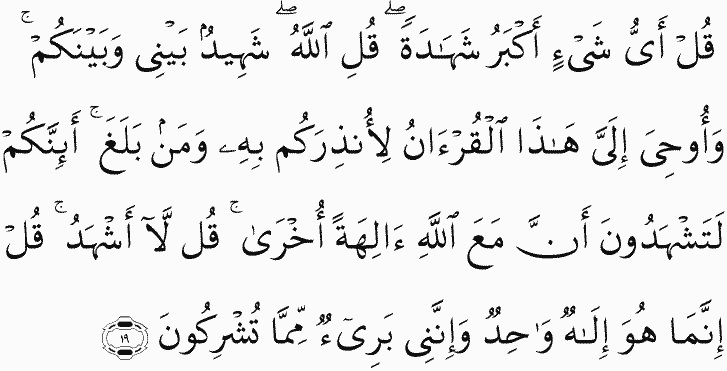 Say, "What thing is greatest in testimony?" Say, " Allah is witness between me and you. And this Qur'an was revealed to me that I may warn you thereby and whomever it reaches. Do you [truly] testify that with Allah there are other deities?" Say, "I will not testify [with you]." Say, "Indeed, He is but one God, and indeed, I am free of what you associate [with Him]."