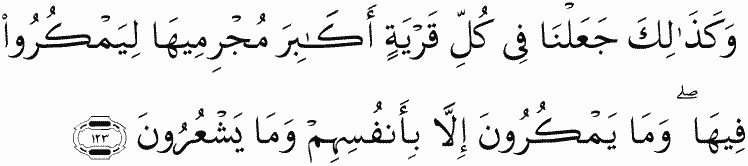 And thus We have placed within every city the greatest of its criminals to conspire therein. But they conspire not except against themselves, and they perceive [it] not.