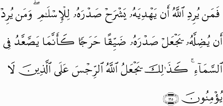 So whoever Allah wants to guide - He expands his breast to [contain] Islam; and whoever He wants to misguide - He makes his breast tight and constricted as though he were climbing into the sky. Thus does Allah place defilement upon those who do not believe.