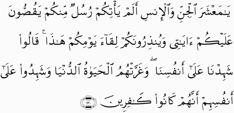 "O company of jinn and mankind, did there not come to you messengers from among you, relating to you My verses and warning you of the meeting of this Day of yours?" They will say, "We bear witness against ourselves"; and the worldly life had deluded them, and they will bear witness against themselves that they were disbelievers.