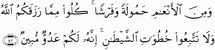 And of the grazing livestock are carriers [of burdens] and those [too] small. Eat of what Allah has provided for you and do not follow the footsteps of Satan. Indeed, he is to you a clear enemy.