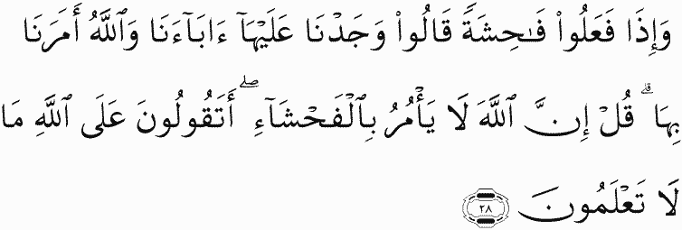 And when they commit an immorality, they say, "We found our fathers doing it, and Allah has ordered us to do it." Say, "Indeed, Allah does not order immorality. Do you say about Allah that which you do not know?"