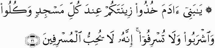 O children of Adam, take your adornment at every masjid, and eat and drink, but be not excessive. Indeed, He likes not those who commit excess.
