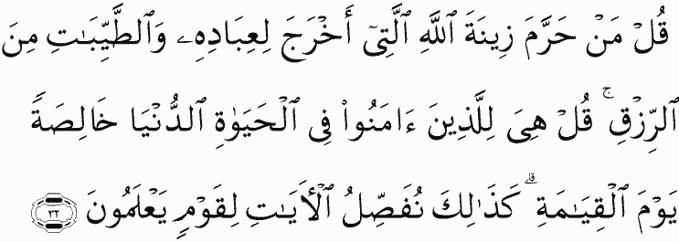 Say, "Who has forbidden the adornment of Allah which He has produced for His servants and the good [lawful] things of provision?" Say, "They are for those who believe during the worldly life [but] exclusively for them on the Day of Resurrection." Thus do We detail the verses for a people who know.