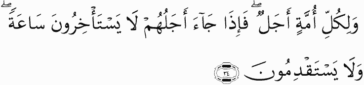 And for every nation is a [specified] term. So when their time has come, they will not remain behind an hour, nor will they precede [it].