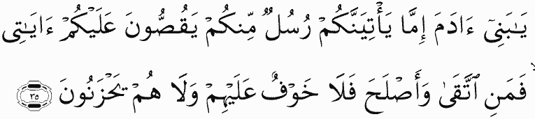 O children of Adam, if there come to you messengers from among you relating to you My verses, then whoever fears Allah and reforms - there will be no fear concerning them, nor will they grieve.