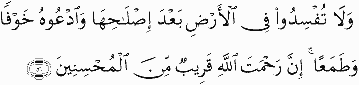 And cause not corruption upon the earth after its reformation. And invoke Him in fear and aspiration. Indeed, the mercy of Allah is near to the doers of good.