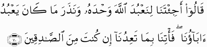 They said, "Have you come to us that we should worship Allah alone and leave what our fathers have worshipped? Then bring us what you promise us, if you should be of the truthful."