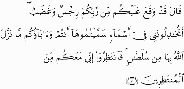 [Hud] said, "Already have defilement and anger fallen upon you from your Lord. Do you dispute with me concerning [mere] names you have named them, you and your fathers, for which Allah has not sent down any authority? Then wait; indeed, I am with you among those who wait."