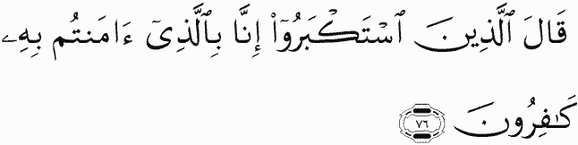Said those who were arrogant, "Indeed we, in that which you have believed, are disbelievers."