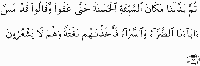 Then We exchanged in place of the bad [condition], good, until they increased [and prospered] and said, "Our fathers [also] were touched with hardship and ease." So We seized them suddenly while they did not perceive.