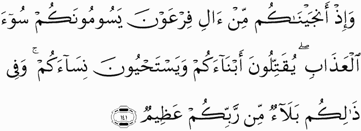 And [recall, O Children of Israel], when We saved you from the people of Pharaoh, [who were] afflicting you with the worst torment - killing your sons and keeping your women alive. And in that was a great trial from your Lord.