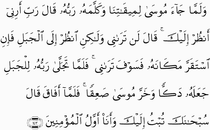 And when Moses arrived at Our appointed time and his Lord spoke to him, he said, "My Lord, show me [Yourself] that I may look at You." [ Allah ] said, "You will not see Me, but look at the mountain; if it should remain in place, then you will see Me." But when his Lord appeared to the mountain, He rendered it level, and Moses fell unconscious. And when he awoke, he said, "Exalted are You! I have repented to You, and I am the first of the believers."