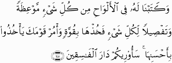 And We wrote for him on the tablets [something] of all things - instruction and explanation for all things, [saying], "Take them with determination and order your people to take the best of it. I will show you the home of the defiantly disobedient."