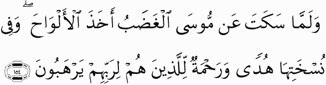And when the anger subsided in Moses, he took up the tablets; and in their inscription was guidance and mercy for those who are fearful of their Lord.
