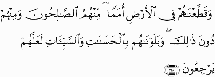 And We divided them throughout the earth into nations. Of them some were righteous, and of them some were otherwise. And We tested them with good [times] and bad that perhaps they would return [to obedience].