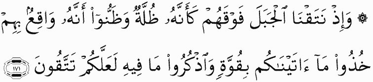 And [mention] when We raised the mountain above them as if it was a dark cloud and they were certain that it would fall upon them, [and Allah said], "Take what We have given you with determination and remember what is in it that you might fear Allah ."