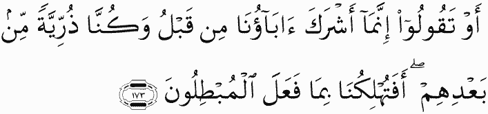 Or [lest] you say, "It was only that our fathers associated [others in worship] with Allah before, and we were but descendants after them. Then would You destroy us for what the falsifiers have done?"