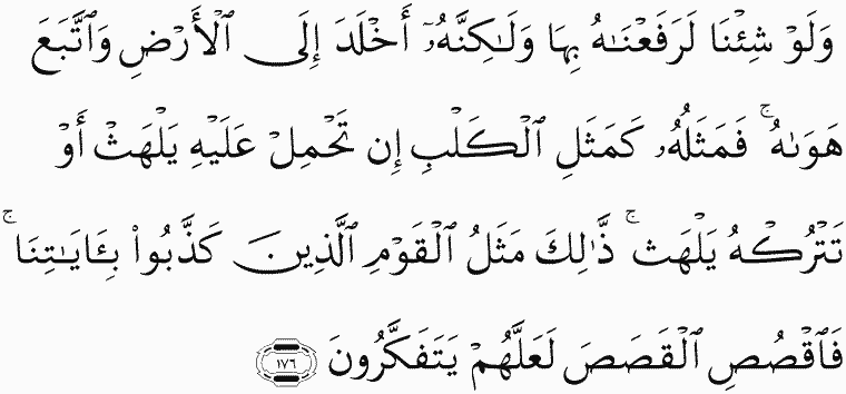 And if We had willed, we could have elevated him thereby, but he adhered [instead] to the earth and followed his own desire. So his example is like that of the dog: if you chase him, he pants, or if you leave him, he [still] pants. That is the example of the people who denied Our signs. So relate the stories that perhaps they will give thought.