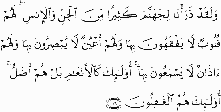 And We have certainly created for Hell many of the jinn and mankind. They have hearts with which they do not understand, they have eyes with which they do not see, and they have ears with which they do not hear. Those are like livestock; rather, they are more astray. It is they who are the heedless.