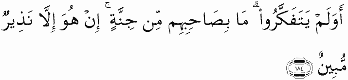 Then do they not give thought? There is in their companion [Muhammad] no madness. He is not but a clear warner.