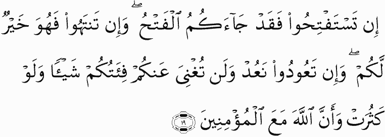 If you [disbelievers] seek the victory - the defeat has come to you. And if you desist [from hostilities], it is best for you; but if you return [to war], We will return, and never will you be availed by your [large] company at all, even if it should increase; and [that is] because Allah is with the believers.