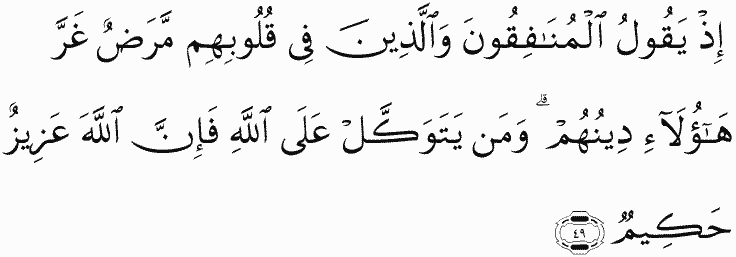 [Remember] when the hypocrites and those in whose hearts was disease said, "Their religion has deluded those [Muslims]." But whoever relies upon Allah - then indeed, Allah is Exalted in Might and Wise.