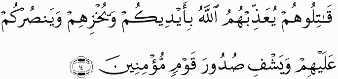 Fight them; Allah will punish them by your hands and will disgrace them and give you victory over them and satisfy the breasts of a believing people