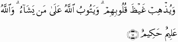 And remove the fury in the believers' hearts. And Allah turns in forgiveness to whom He wills; and Allah is Knowing and Wise.