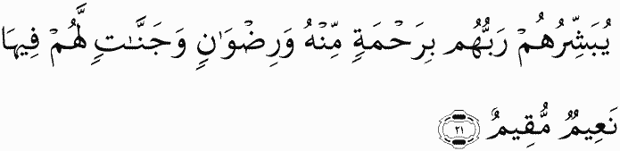 Their Lord gives them good tidings of mercy from Him and approval and of gardens for them wherein is enduring pleasure.