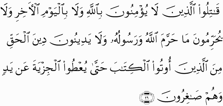 Fight those who do not believe in Allah or in the Last Day and who do not consider unlawful what Allah and His Messenger have made unlawful and who do not adopt the religion of truth from those who were given the Scripture - [fight] until they give the jizyah willingly while they are humbled.