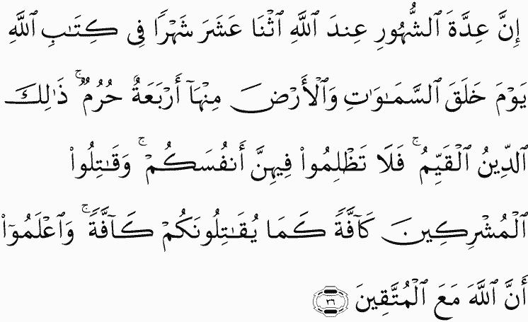 Indeed, the number of months with Allah is twelve [lunar] months in the register of Allah [from] the day He created the heavens and the earth; of these, four are sacred. That is the correct religion, so do not wrong yourselves during them. And fight against the disbelievers collectively as they fight against you collectively. And know that Allah is with the righteous [who fear Him].