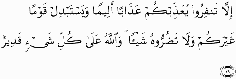 If you do not go forth, He will punish you with a painful punishment and will replace you with another people, and you will not harm Him at all. And Allah is over all things competent.