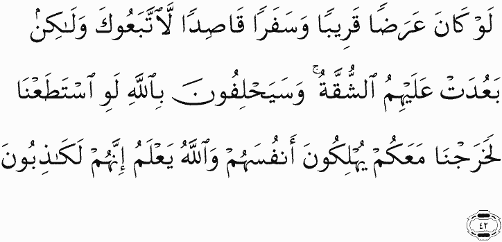 Had it been an easy gain and a moderate trip, the hypocrites would have followed you, but distant to them was the journey. And they will swear by Allah , "If we were able, we would have gone forth with you," destroying themselves [through false oaths], and Allah knows that indeed they are liars.