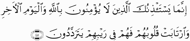 Only those would ask permission of you who do not believe in Allah and the Last Day and whose hearts have doubted, and they, in their doubt, are hesitating.