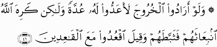 And if they had intended to go forth, they would have prepared for it [some] preparation. But Allah disliked their being sent, so He kept them back, and they were told, "Remain [behind] with those who remain."