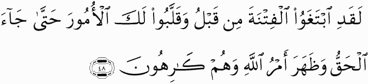 They had already desired dissension before and had upset matters for you until the truth came and the ordinance of Allah appeared, while they were averse.