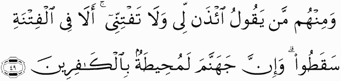 And among them is he who says, "Permit me [to remain at home] and do not put me to trial." Unquestionably, into trial they have fallen. And indeed, Hell will encompass the disbelievers.