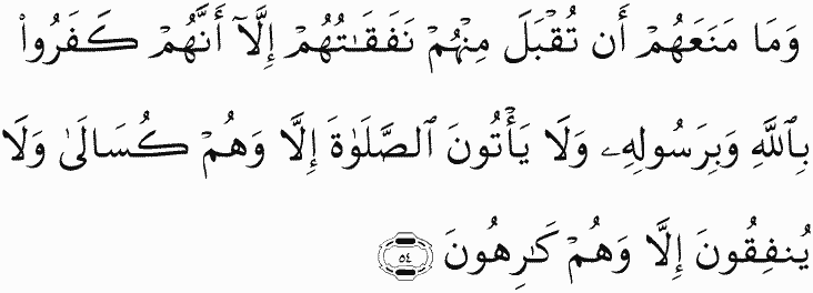 And what prevents their expenditures from being accepted from them but that they have disbelieved in Allah and in His Messenger and that they come not to prayer except while they are lazy and that they do not spend except while they are unwilling.