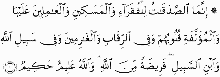 Zakah expenditures are only for the poor and for the needy and for those employed to collect [zakah] and for bringing hearts together [for Islam] and for freeing captives [or slaves] and for those in debt and for the cause of Allah and for the [stranded] traveler - an obligation [imposed] by Allah . And Allah is Knowing and Wise.