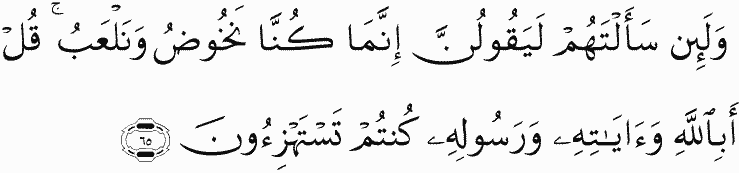 And if you ask them, they will surely say, "We were only conversing and playing." Say, "Is it Allah and His verses and His Messenger that you were mocking?"