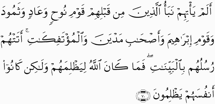 Has there not reached them the news of those before them - the people of Noah and [the tribes of] 'Aad and Thamud and the people of Abraham and the companions of Madyan and the towns overturned? Their messengers came to them with clear proofs. And Allah would never have wronged them, but they were wronging themselves.